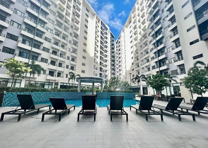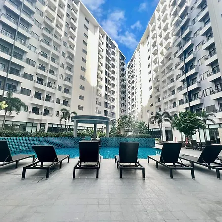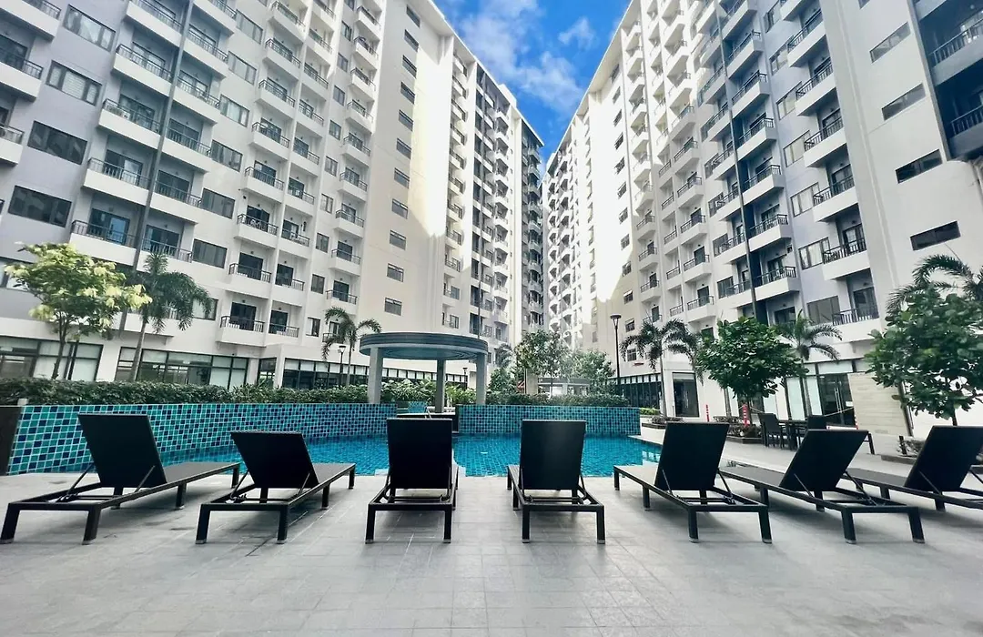 プールの景色を見渡すLighthue Staycation Paranaque マニラ市アパートは、マニラ市のサン・バレーから徒歩で15分です。 涼しいプールでくつろぐこともできます。
